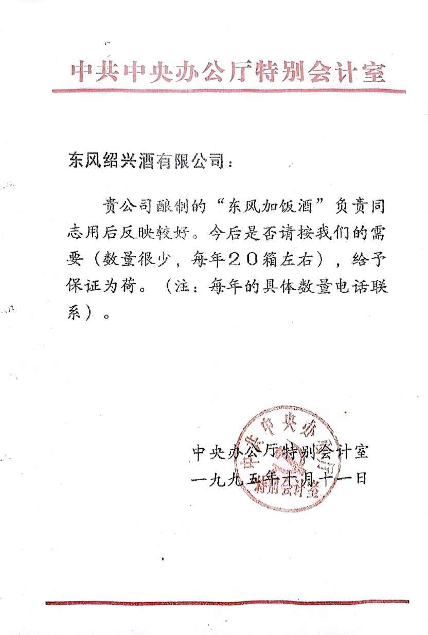 1949年開國大典晚宴,周恩來總理親自批示使用紹興黃酒作為開國用酒:當時茅臺尚未建廠,還只是赤水河邊的有待整合的若干小作坊。在那個年代,黃酒比白酒更金貴,各類生活物資尤其是糧食格外緊缺,只有會稽山前身云集酒廠等極少數(shù)酒廠還能有糯米釀酒,為了表示國宴的重要性,周恩來特地從紹興緊急調(diào)撥了一批陳年紹興黃酒,這些酒也成了蘭亭酒的“樣品酒”。
