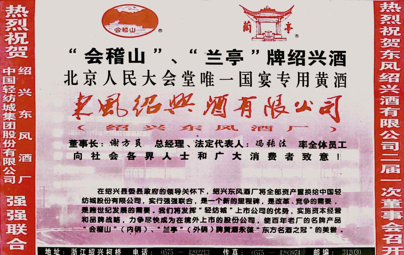1998年,會稽山·蘭亭成為人民大會堂唯一制定黃酒:國宴用菜一直是淮揚菜,這也是當年周總理定下來的,主要是考慮到淮揚菜口味適中,比較容易被各地、各個國家的人接受,而口味適中的淮揚菜最適合配較為低度、同樣口感較為適中的黃酒,于是在身為江蘇揚州人的江澤民總書記的指定下,會稽山蘭亭被人民大會堂指定為國宴專用黃酒。
